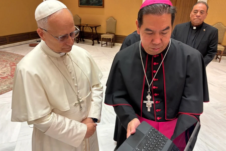 Pope Leo XIV receives a video from the Hope Border Institute from Auxiliary Bishop Anthony Celino on Oct. 8, 2025.